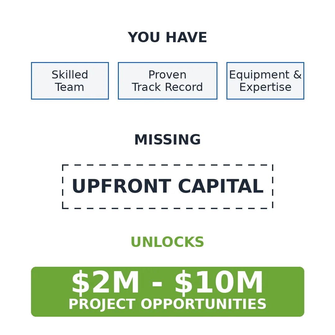 I understand that your company is capable of handling million-dollar projects, and I also know that the only thing preventing you from a big “payday” is that initial upfront capital.